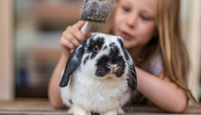 Regular brushing two to three times a week with a suitable comb will help remove loose fur and prevent knots. Long-haired rabbits will need daily grooming to keep their coat in great condition. Start with a wide-toothed comb on small areas at a time to remove knots, then switch to a slicker brush to remove loose fur and dirt.